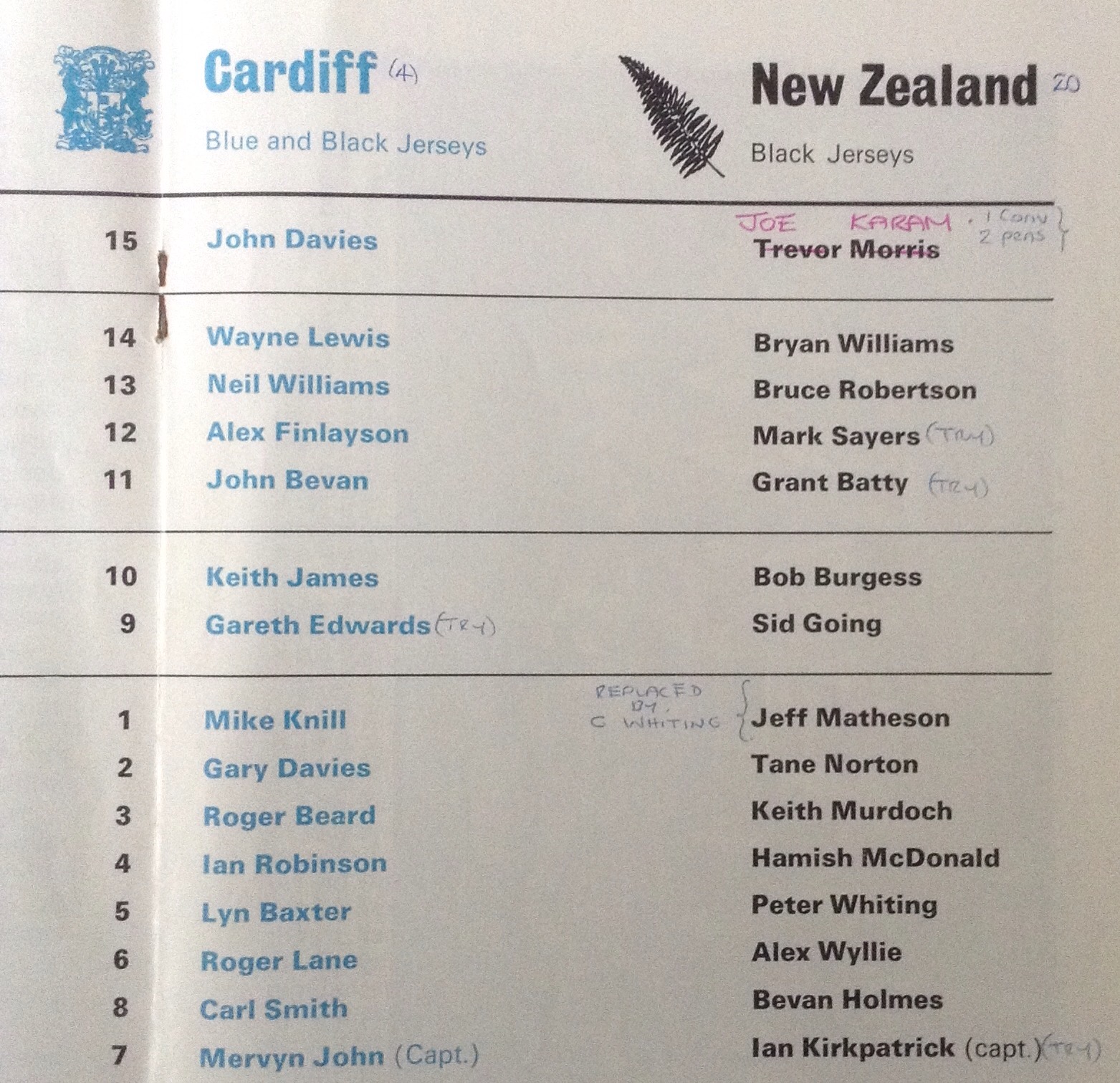 New Zealand had the big guns out for this game, captain Ian Kirkpatrick led a team consisting of legends such as Sid Going, Bryan Williams, Grant Batty, Joe Karam and Keith Murdoch, who went on to become infamous for punching a Security guard after Wales played New Zealand later that month.
