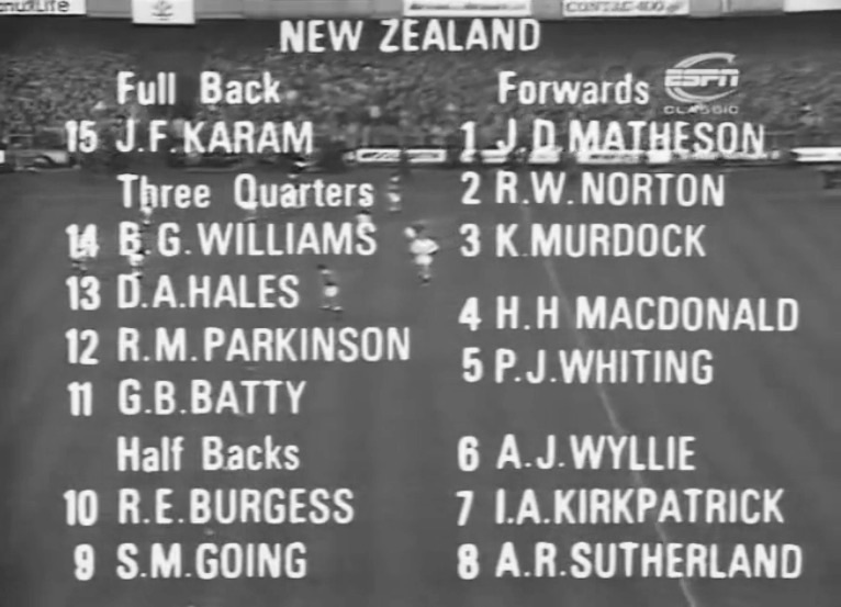 Joe Karam missed the conversion but kicked another penalty soon after, followed by one from Phil Bennett on twenty two minutes, to give the All Blacks a 13-3 half time lead.