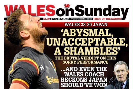 The biggest home attendance in Wales autumn series, 73,969, witnessed kamikaze rugby from the home team, as Japan gave them a lesson in back play, rugby hari kari was saved by a last second drop goal from replacement Sam Davies, as Wales rising sun almost sank without trace.