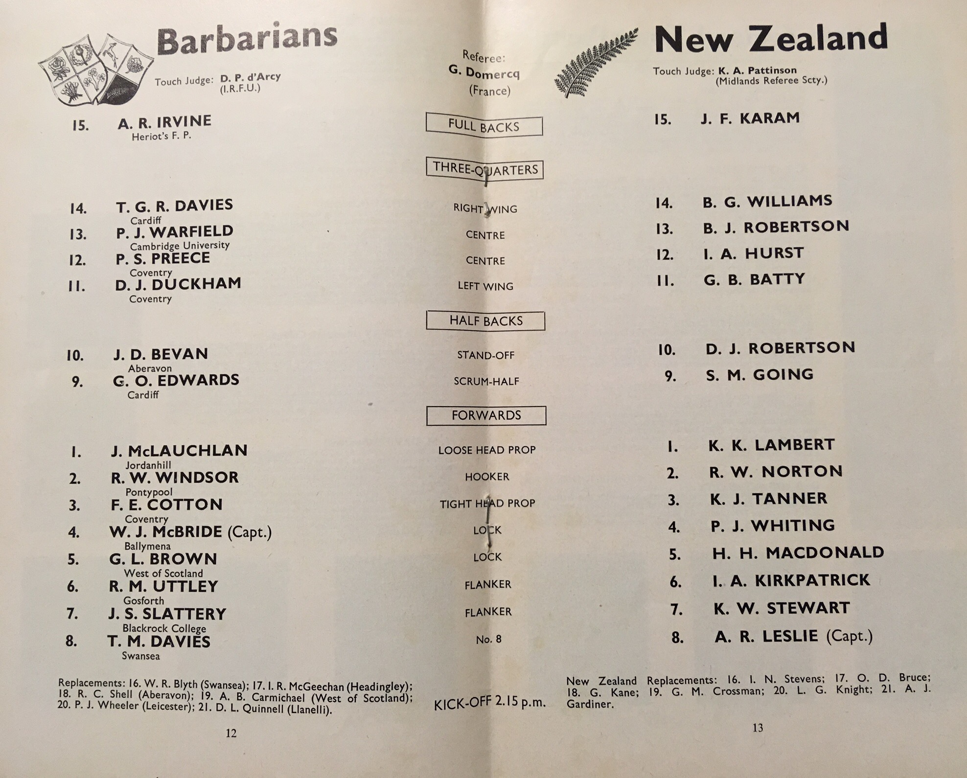 Domerq was invited to referee the Barbarians “re match”with the All Blacks, the following year at Twickenham, when a Mervyn Davies try saved the day and the match ended with honours even at 13-13, the only match New Zealand failed to win on that tour.