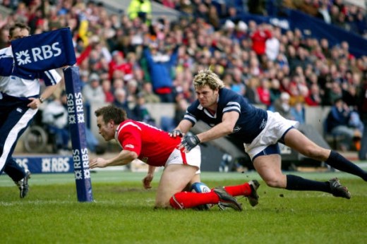 Scotland 0-7 Wales4 mins: Ryan Jones produces a scintillating break after a loose kick by Hugo Southwell. Jones has plenty of support and gets the final pass back from Martyn Williams for the try after a series of slick passes. Stephen Jones nails the conversion.