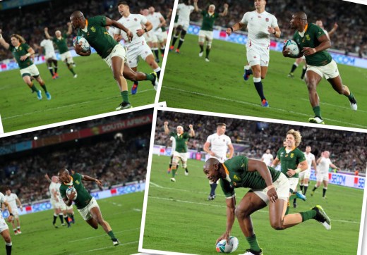 It is the 2019 Rugby World Cup final, 65:43 on the clock and South Africa lead England 18-12, from a South African scrum near half way, Faff Du Klerk feeds Lukhanyo Am, who passes left to Malcolm Marx……… Makazole Mapimpi takes up the story from here.