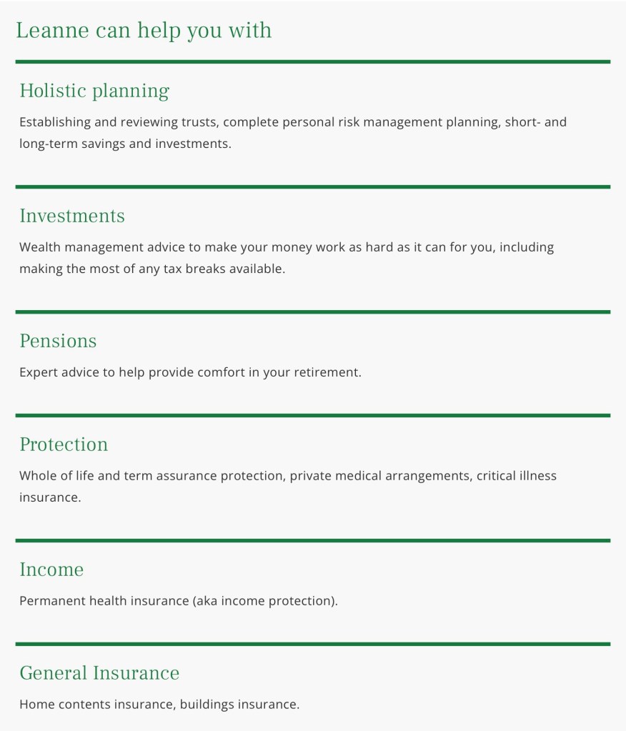 There are all sorts of financial minefields to negotiate these days, too many to list here, but Leanne has got them all covered. She will be happy to chat to you, whether it’s for a free initial consultation or to discuss your current situation. So get in touch and I can guarantee you will get a quality service and in a delightful friendly manner.