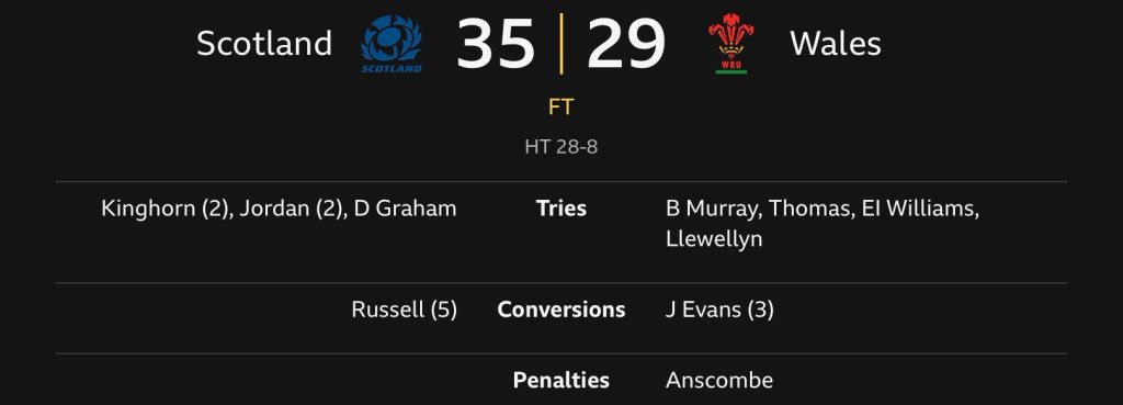 All the power and precision evident in Cardiff was nowhere to be seen as the home side cut through at will. Scotland’s 28-8 half time lead was extended to 35-8 eight minutes into the second period, but that was the last time Scotland troubled the scoreboard.