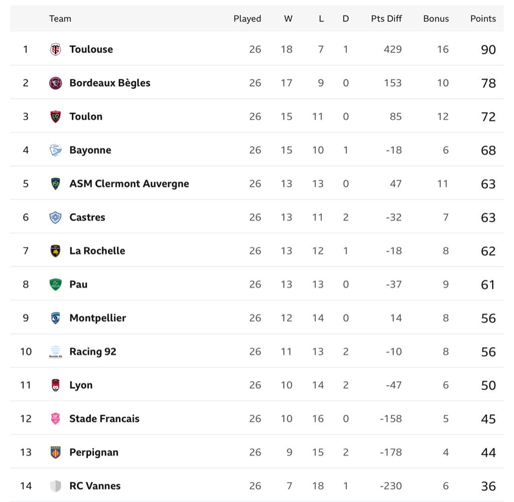 The final Top 14 table makes interesting reading La Rochelle missed out on the knock-out stages by a single point.