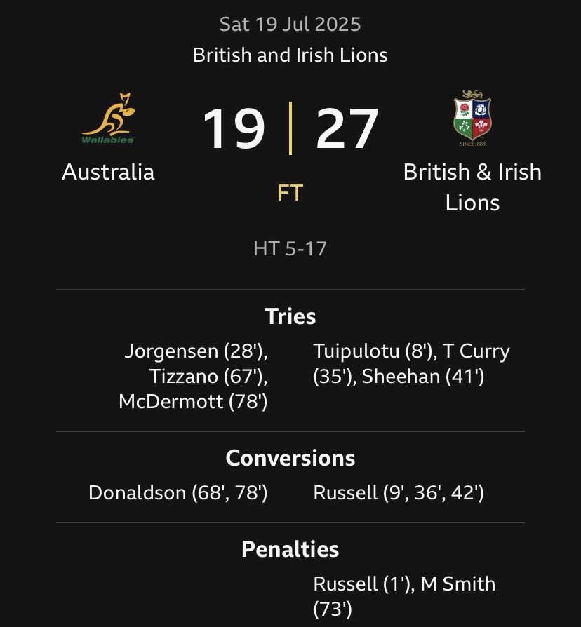 With Finn Russell in sparkling form the Lions bossed the first half building up a 17-5 lead, the only blemish being Australia’s 28th minute try that gave them a lifeline to cling onto at the interval.