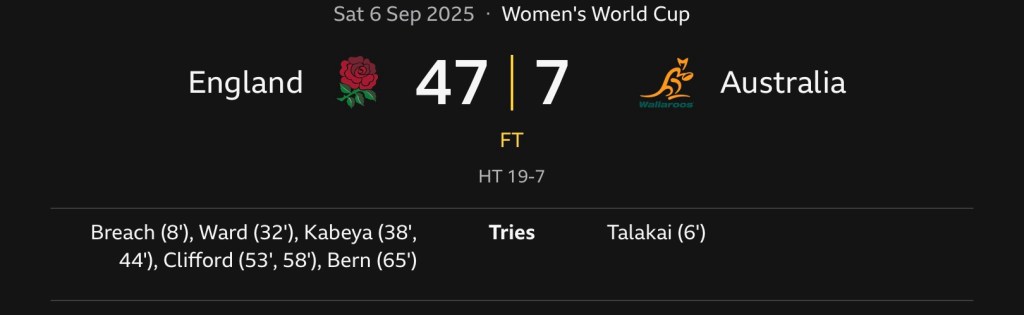England’s 47-7 win meant they ended the day as Pool A winners and now face Scotland in a Bristol Quarter Final next Sunday.