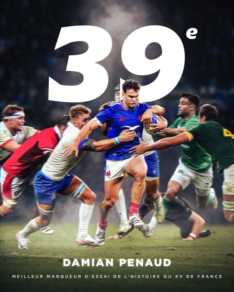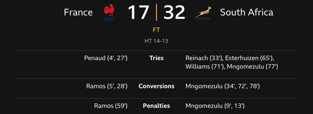 Damian Penaud’s first half brace of tries, the first after just four minutes, gave France a narrow 14-13 half time lead with the Boks further punished by Lood De Jäger’s 39th minute permanent red card.