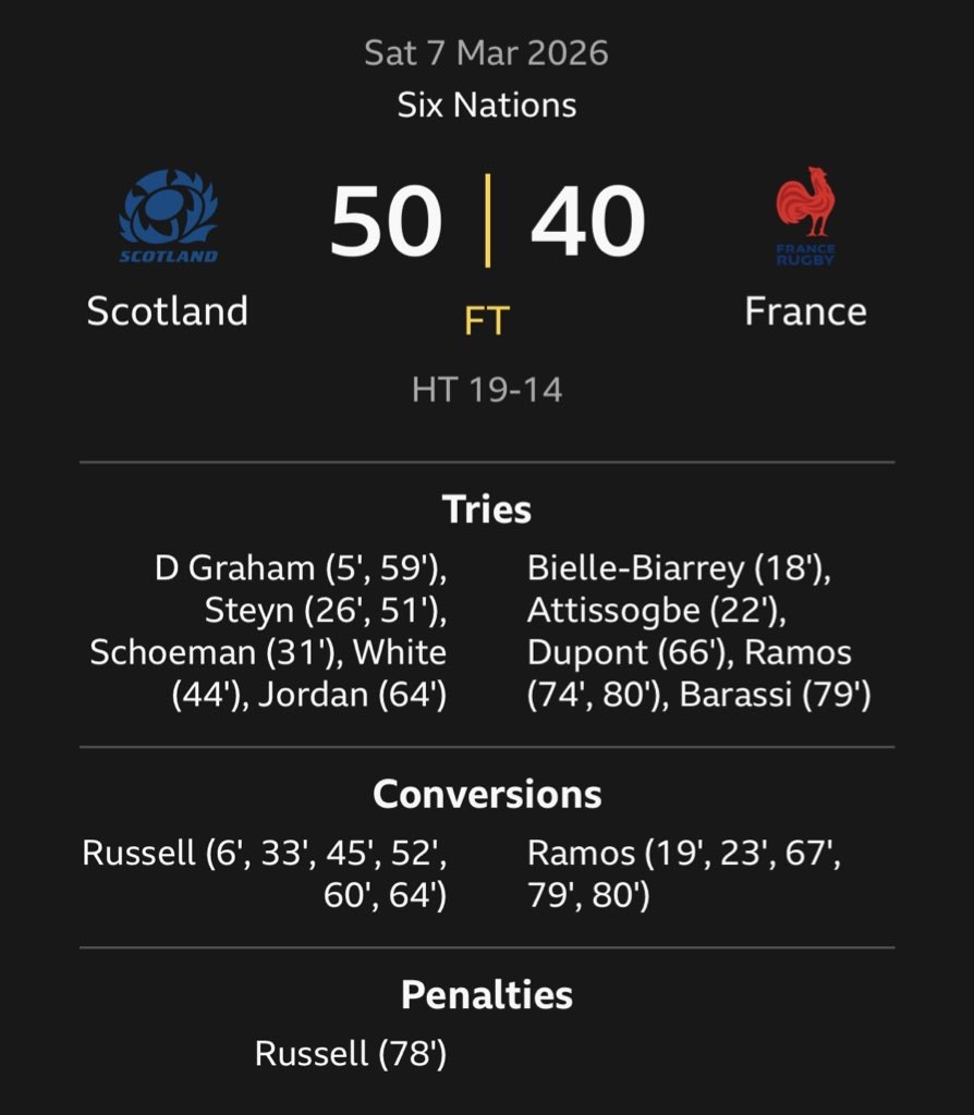 It was only when Scotland led 47-14 that France found their mojo. Four tries in the final fourteen minutes made the scoreboard respectable and ensured the visitors gained a try scoring bonus point that could prove crucial to their championship hopes, which despite the 50-40 defeat are still alive and kicking.